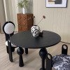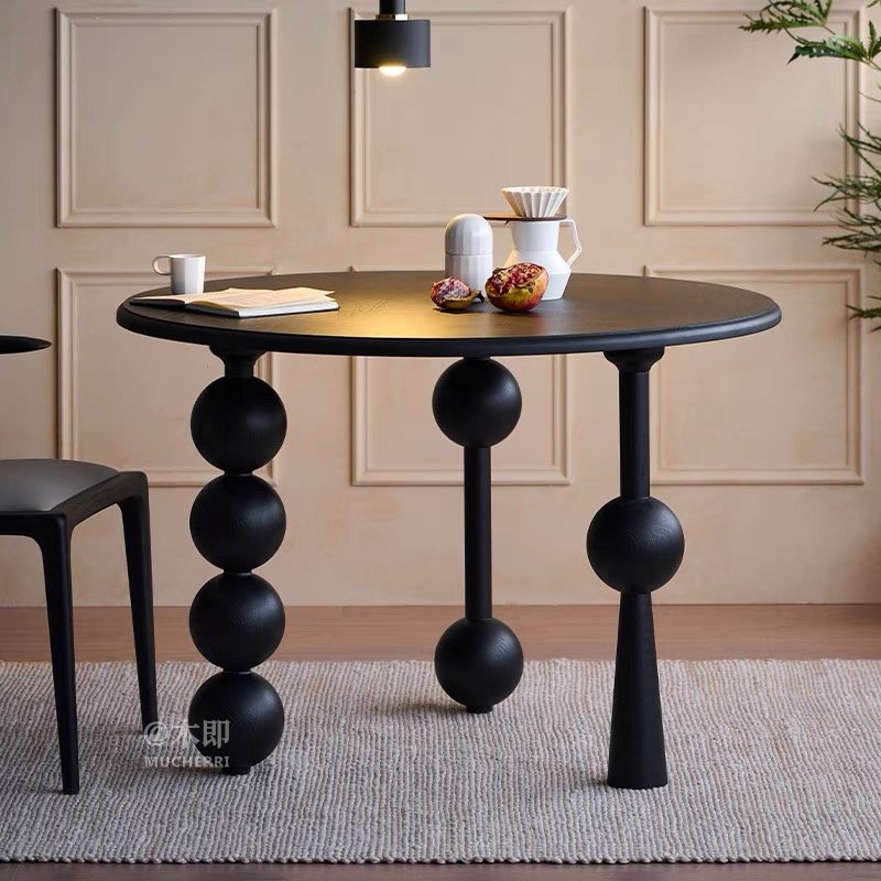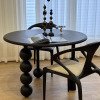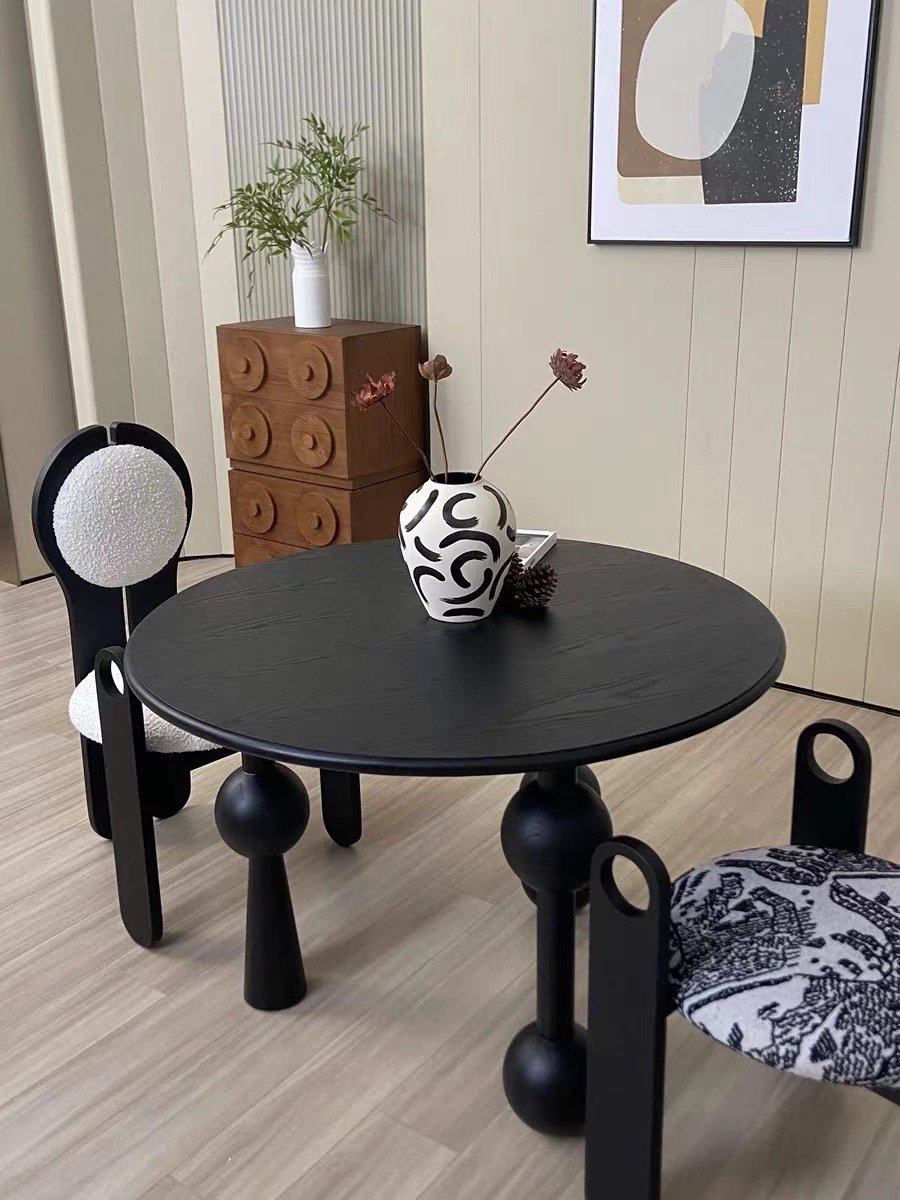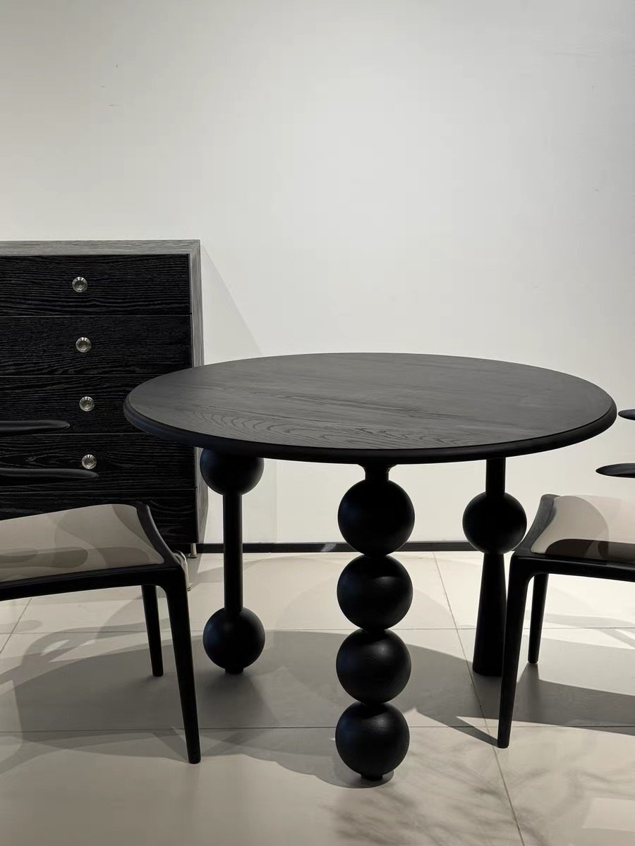 Hình dáng tròn với đường kính 110cm, cao 75cm, bàn mang đến cảm giác ấm cúng và kết nối. Chân bàn là điểm nhấn ấn tượng, với những khối hình tròn và nón đan xen, tạo nên một tổng thể vừa vững chãi, vừa giàu tính điêu khắc. Đây không chỉ là một chiếc bàn, mà còn là một tác phẩm nghệ thuật giữa lòng không gian sống.