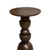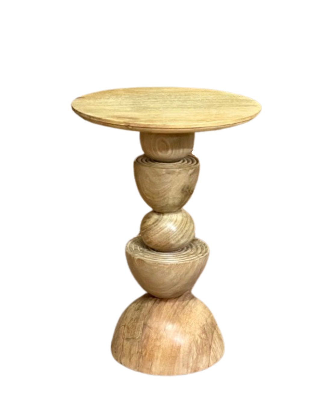Chân bàn được chia thành bốn phần đối xứng, với điểm nhấn là hai khối cầu trung tâm, xen kẽ giữa các lớp gỗ được xếp vòng tròn, tạo chiều sâu và sự liên kết hài hòa. Đế bàn vững chắc, hơi loe ra giúp tăng độ ổn định, đồng thời tôn lên vẻ đẹp mạnh mẽ, cá tính của tổng thể thiết kế.