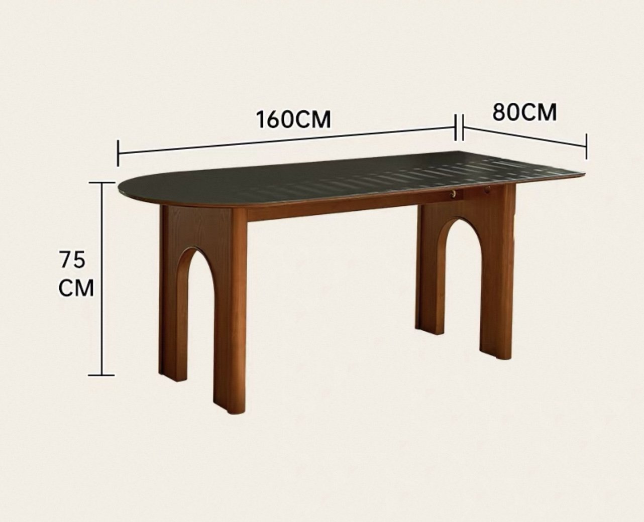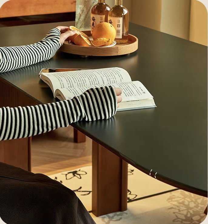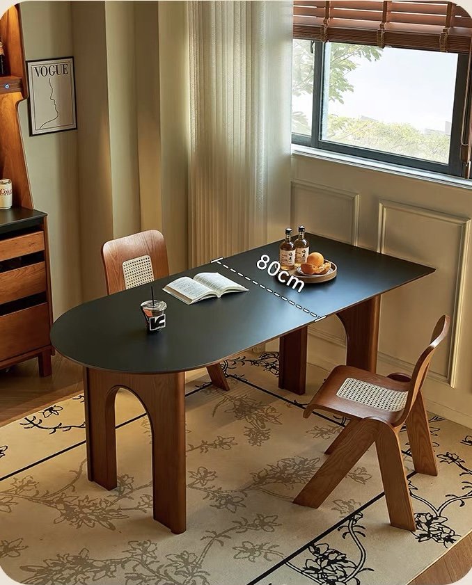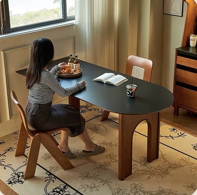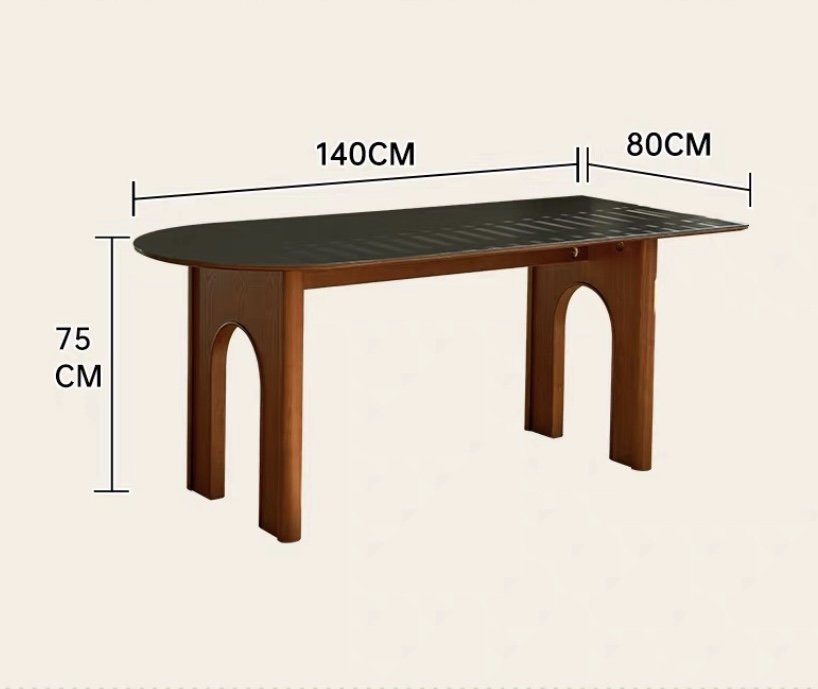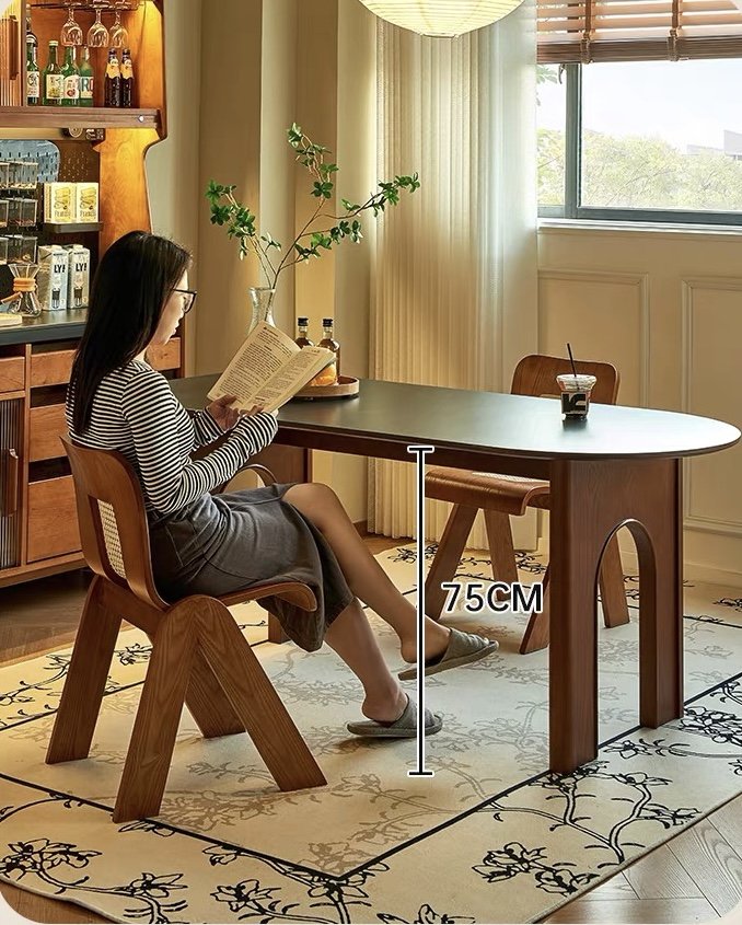 Rộng rãi, tối ưu cho gia đình 4–6 người. Mặt bàn dài và chân vòm tạo cảm giác thoáng, giúp không gian ăn uống trở nên ấm cúng và lịch sự.
