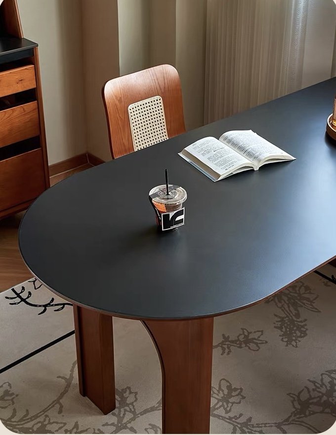 Ấn tượng đầu tiên về Bàn Moca nằm ở mặt bàn bo tròn thanh lịch, phủ lớp màu đen mờ sang trọng. Tông màu tối cao cấp không chỉ làm nổi bật vẻ hiện đại mà còn tăng chiều sâu thị giác, tạo cảm giác nhẹ nhàng và thư thái trong không gian.