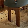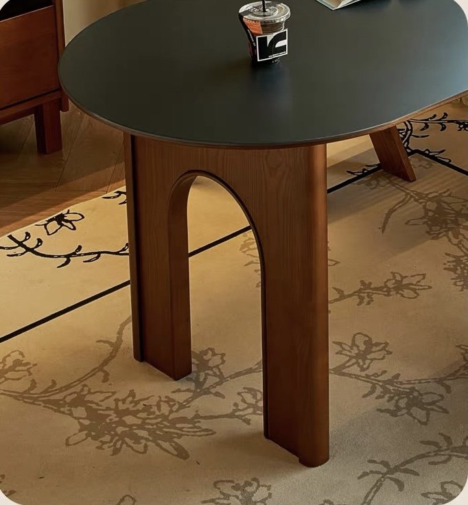 Phần chân bàn được tạo hình kiểu vòm (arch) – xu hướng nội thất đương đại đang được ưa chuộng tại châu Âu. Đường cong mềm mại của khung chân kết hợp với chất gỗ hồng sắc ấm tạo nên sự hài hòa, vừa vững chãi lại vừa nghệ thuật. Thiết kế này giúp bàn nổi bật như một món “furniture art” – đồ nội thất mang tính nghệ thuật, không chỉ để dùng mà còn để thưởng lãm.