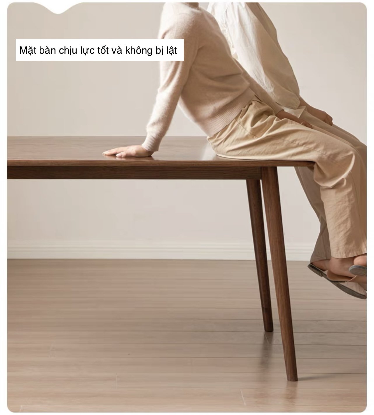 ⦁ Kết cấu vững chắc, có khả năng chịu lực tốt, thậm chí hai người trưởng thành có thể ngồi lên mép bàn mà không bị lật hay rung lắc.