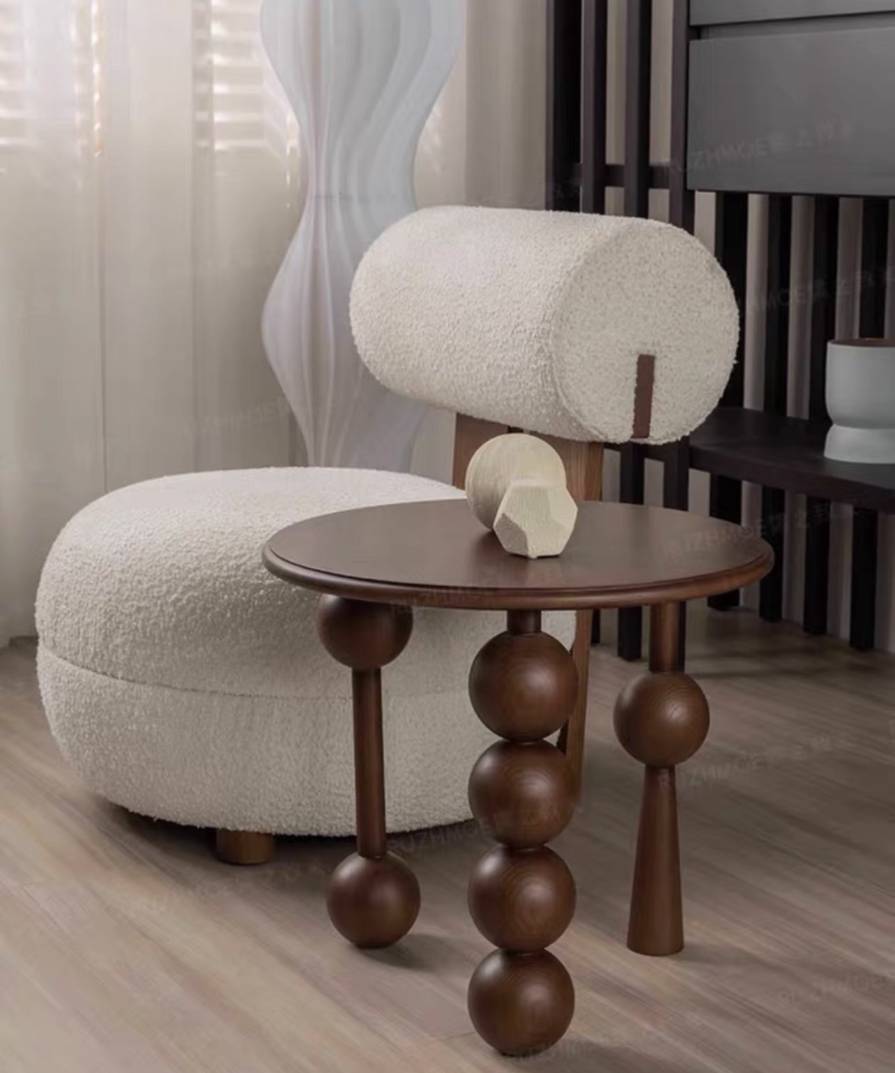 Không chỉ là một chiếc bàn thông thường, sản phẩm này mang trong mình hơi thở của nghệ thuật và sự tinh tế trong từng đường nét. Chân bàn với hình khối cầu được bố trí bất đối xứng tạo ra sự cân bằng thị giác đầy thú vị. Chất liệu gỗ hồng sắc mang đến cảm giác ấm áp và sang trọng, giúp nâng tầm không gian sống.