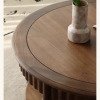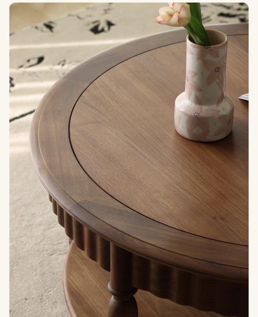 Romance in Bloom sở hữu cấu trúc hình tròn hoàn mỹ, cân bằng giữa tính thẩm mỹ và công năng. Mặt bàn được bo tròn mềm mại, giúp không gian trở nên nhẹ nhàng và thanh thoát hơn. Điểm nhấn tinh tế nằm ở phần viền mặt bàn chạm khắc dạng sóng – những nếp gợn uyển chuyển được xử lý tinh xảo, tạo hiệu ứng ánh sáng đẹp mắt khi ánh nắng hoặc ánh đèn chiếu lên, mang lại cảm giác như một làn gió nhẹ đang lướt qua bề mặt gỗ.