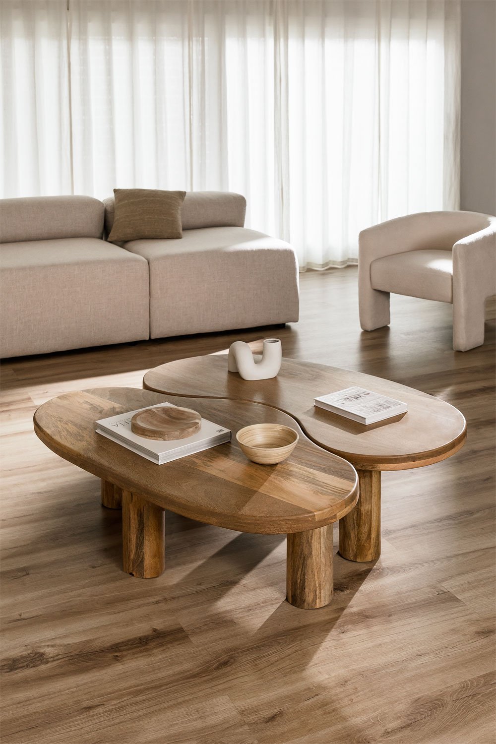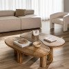 Bàn Vinyl có hình dáng bất đối xứng lấy cảm hứng từ những đường cong mềm mại của thiên nhiên. Sự cân bằng giữa vẻ đẹp thô mộc và thiết kế hiện đại giúp chiếc bàn dễ dàng hòa nhập vào nhiều phong cách nội thất khác nhau, từ Scandinavian, Japandi, Wabi-sabi đến Modern Organic.