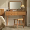 Bàn trang điểm Cozy sở hữu dáng bàn thanh thoát với các góc bo tròn mềm mại, tạo cảm giác nhẹ nhàng và hài hòa trong không gian. Mặt bàn rộng rãi với kết cấu vân gỗ tự nhiên giúp làm nổi bật vẻ đẹp mộc mạc nhưng không kém phần sang trọng. Các chi tiết được gia công tỉ mỉ, từ những đường nét mượt mà cho đến tay nắm ngăn kéo bằng kim loại mạ vàng tinh tế, tất cả đều góp phần tạo nên một thiết kế vừa hiện đại vừa mang nét ấm áp của nội thất gỗ truyền thống.